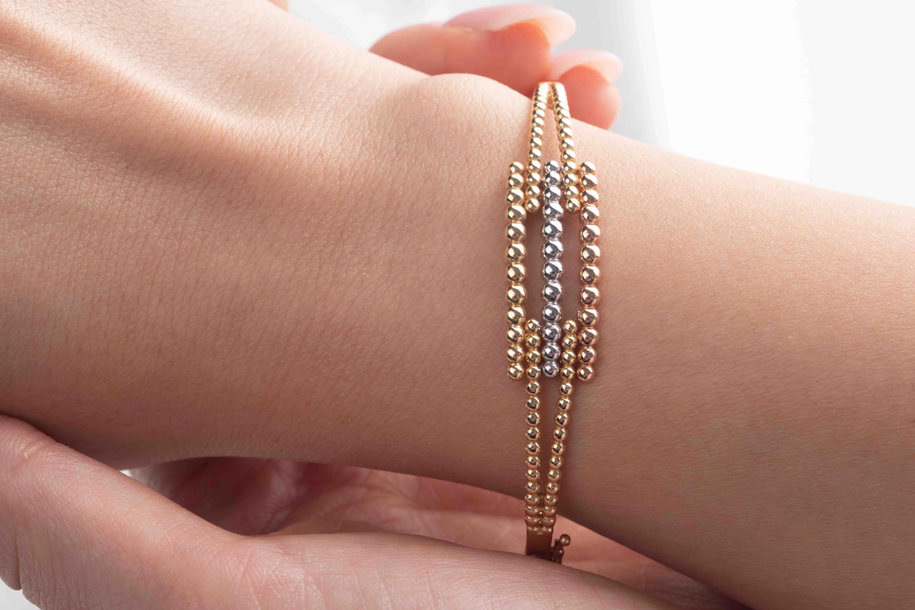 Dayanıklı ve esnek yapısıyla günlük kullanımda konfor sağlarken, özel davetlerde üç renkli altının ışıltısı şıklığınızı vurgular. İnce işçilik ve parlak cilasıyla her açıdan dikkat çeken bir aksesuar deneyimi sunar.