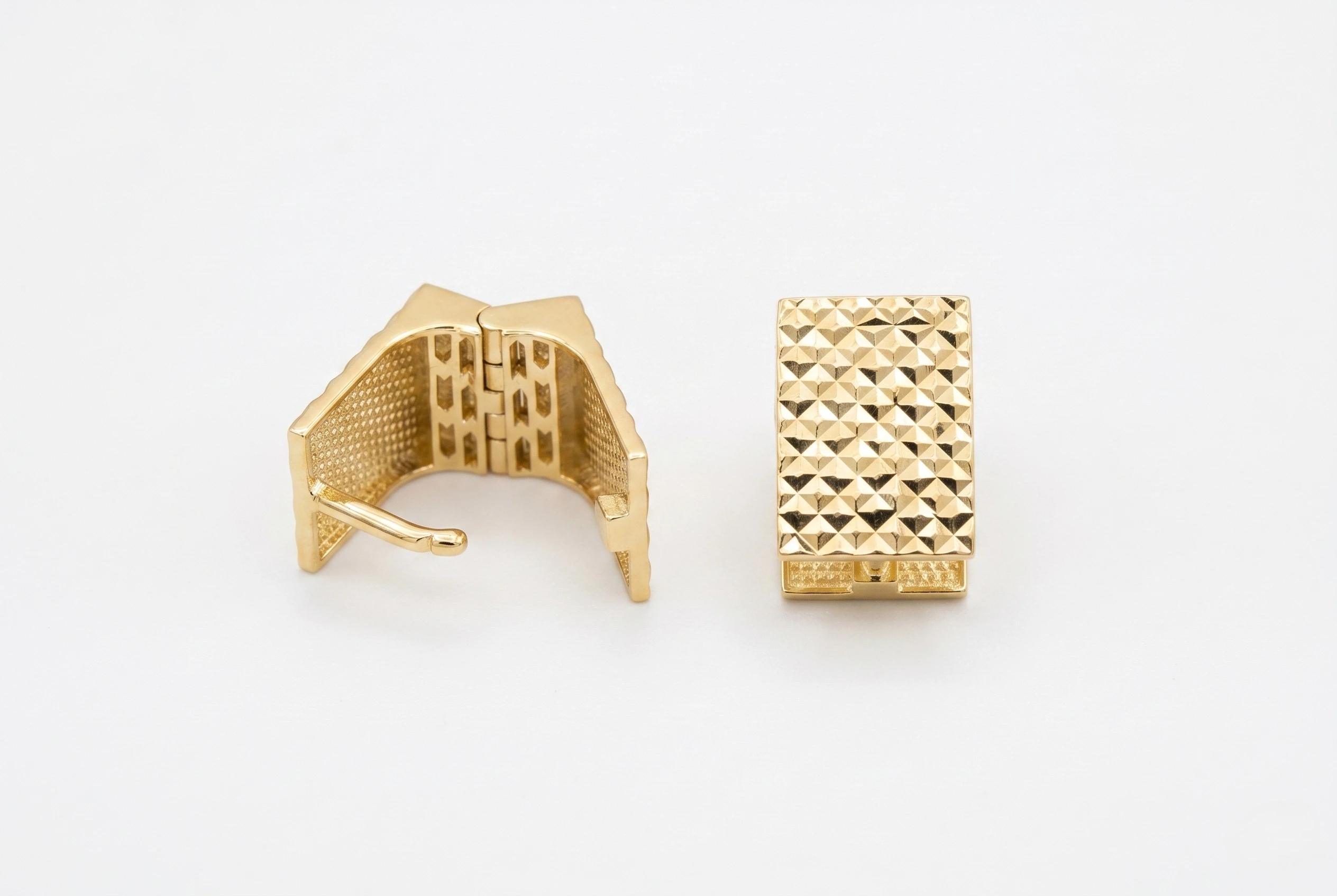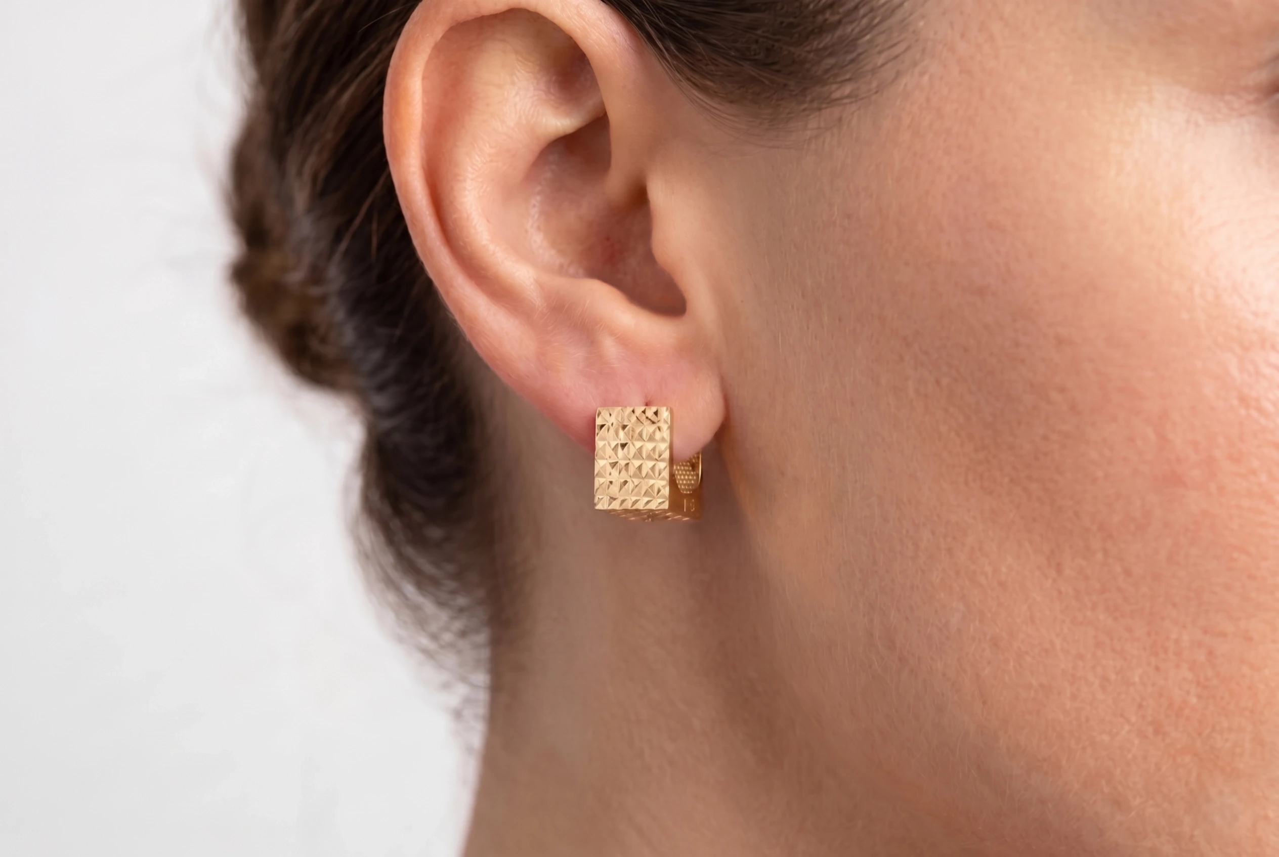 Dokulu yüzeyi ve dikdörtgen formuyla öne çıkan bu küpe, modern ve dengeli bir stil sunar.