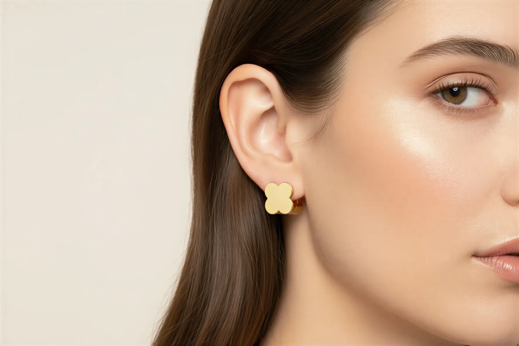 Parlak yüzeyi ve yonca formuyla öne çıkan bu küpe, sade ama dikkat çekici bir stil sunar.