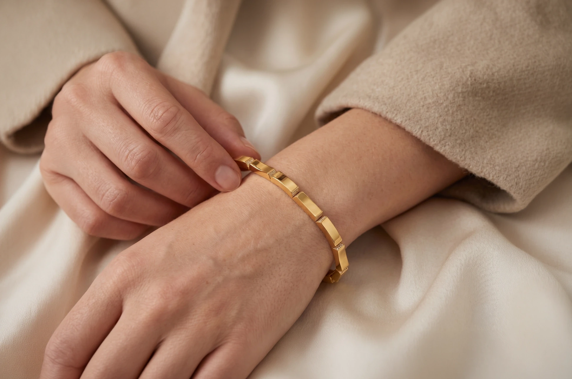 Segment blok yapısıyla öne çıkan bu bileklik, güçlü formu ve dengeli görünümüyle modern bir stil sunar.
