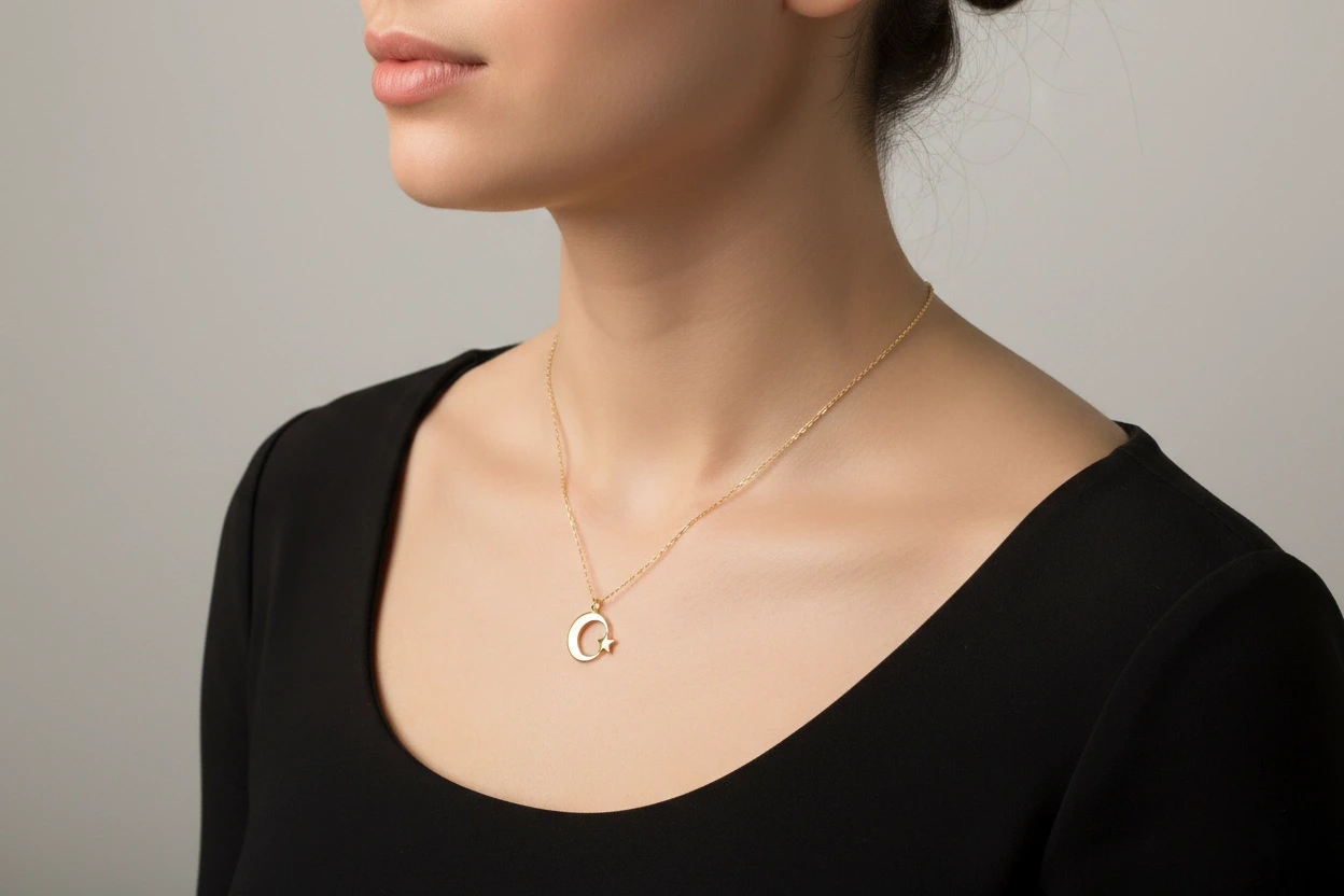 | Tasarım | Ay yıldız sembolünün zarif ve modern çizgilerle işlendiği minimal kolye tasarımı |