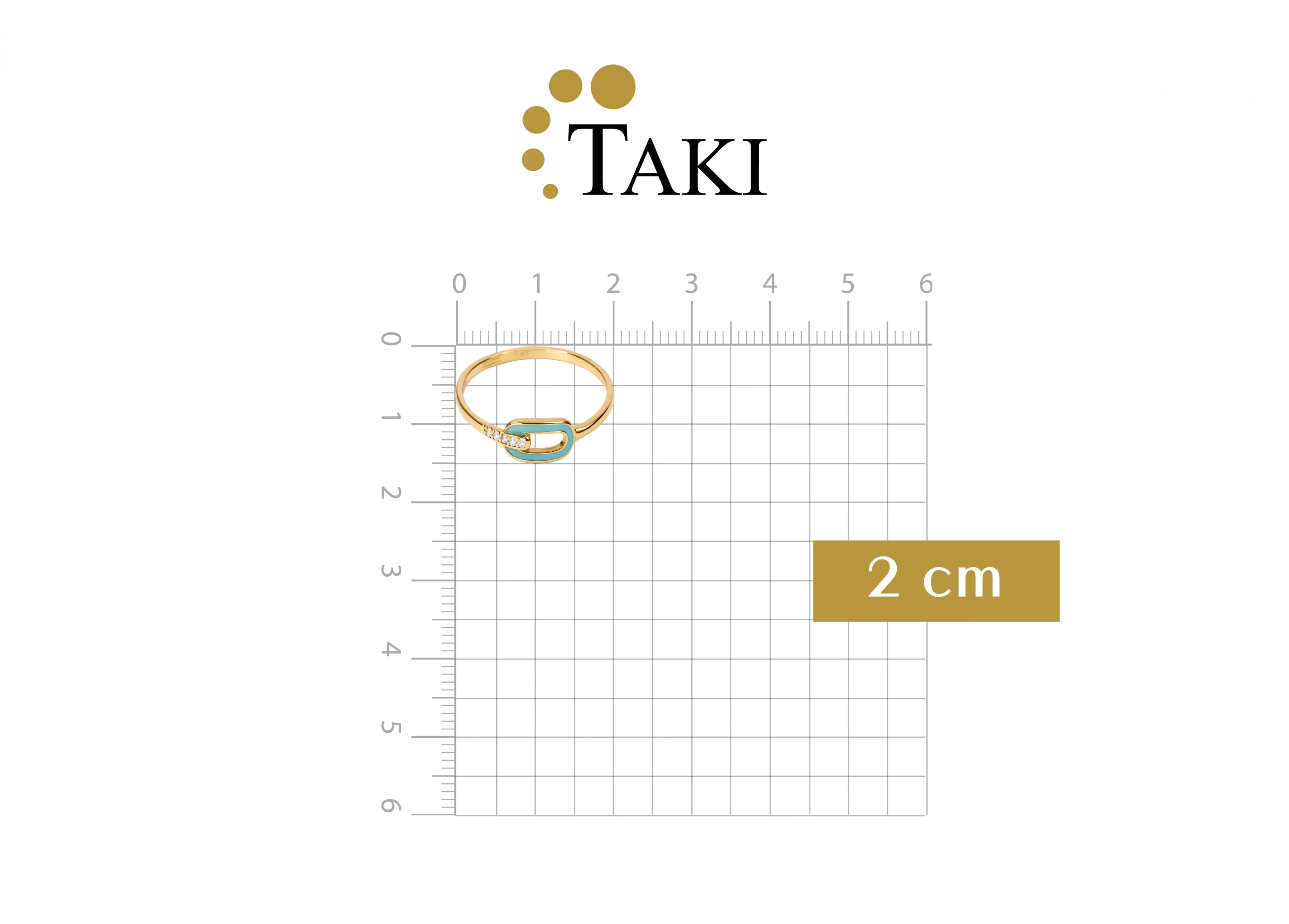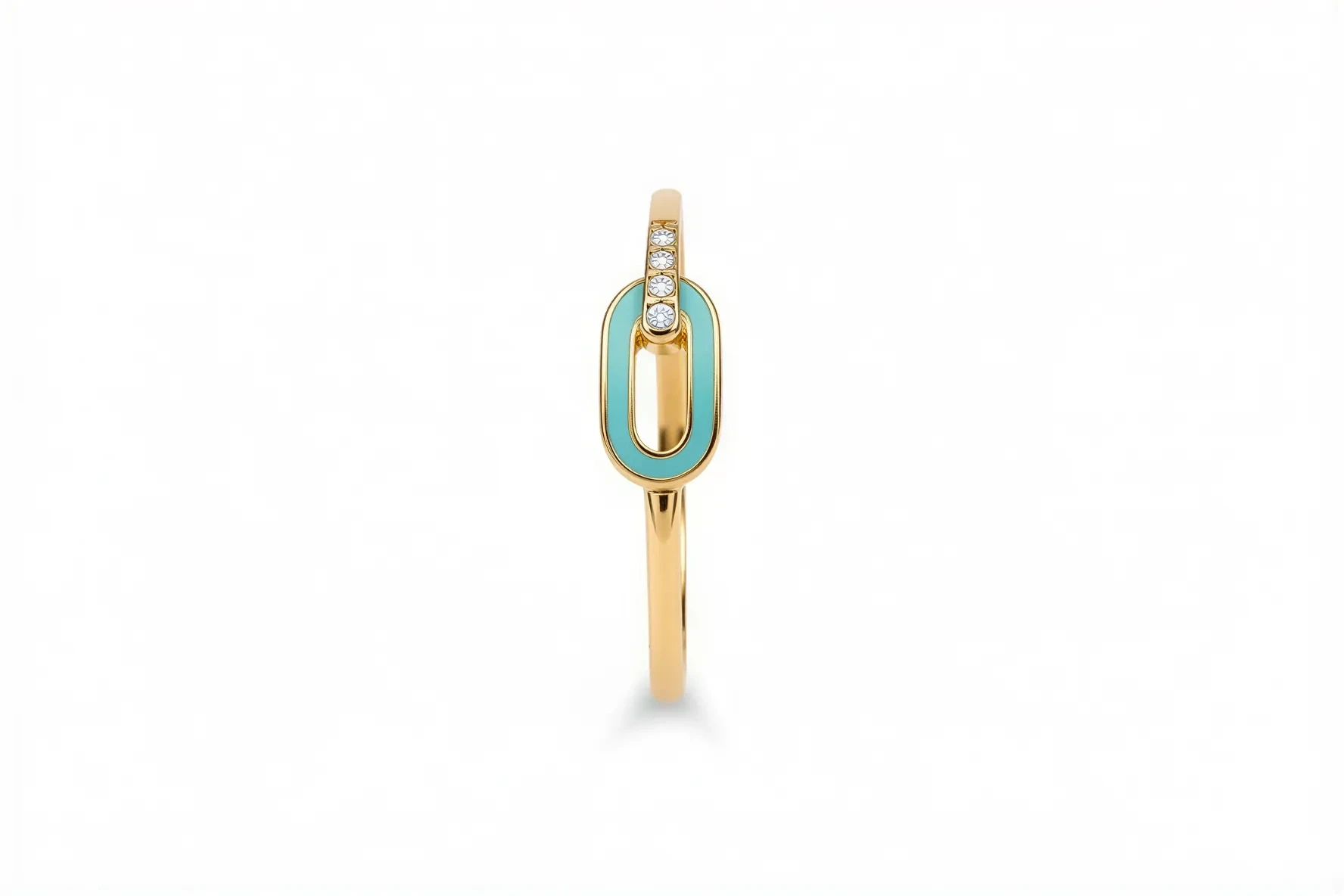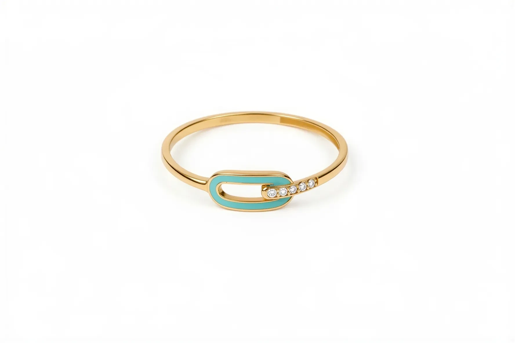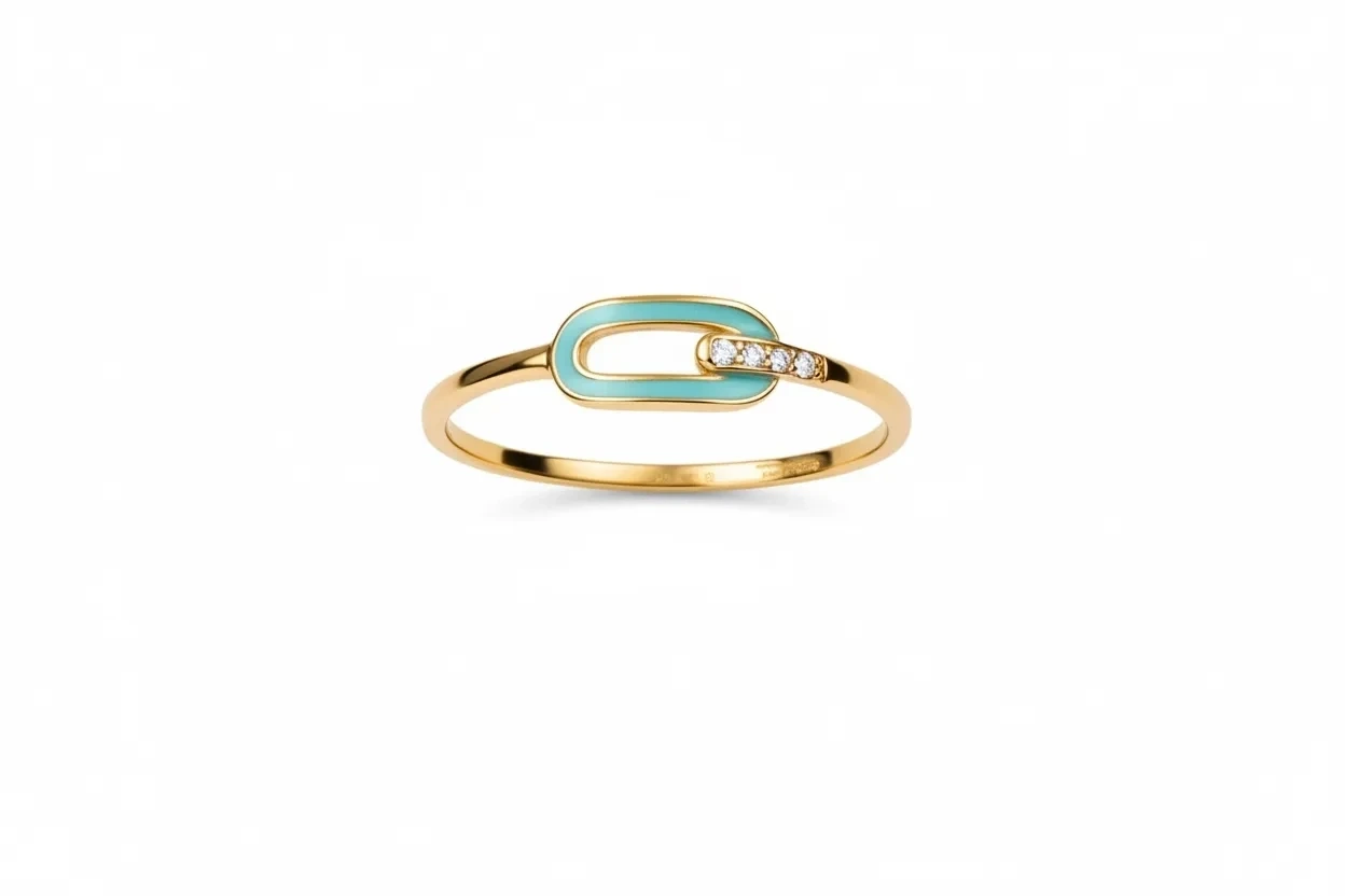 Turkuaz minenin canlı tonuyla birleşen ataç formu, modern bir dokunuş sunan şık ve zarif bir yüzüğe dönüşüyor.