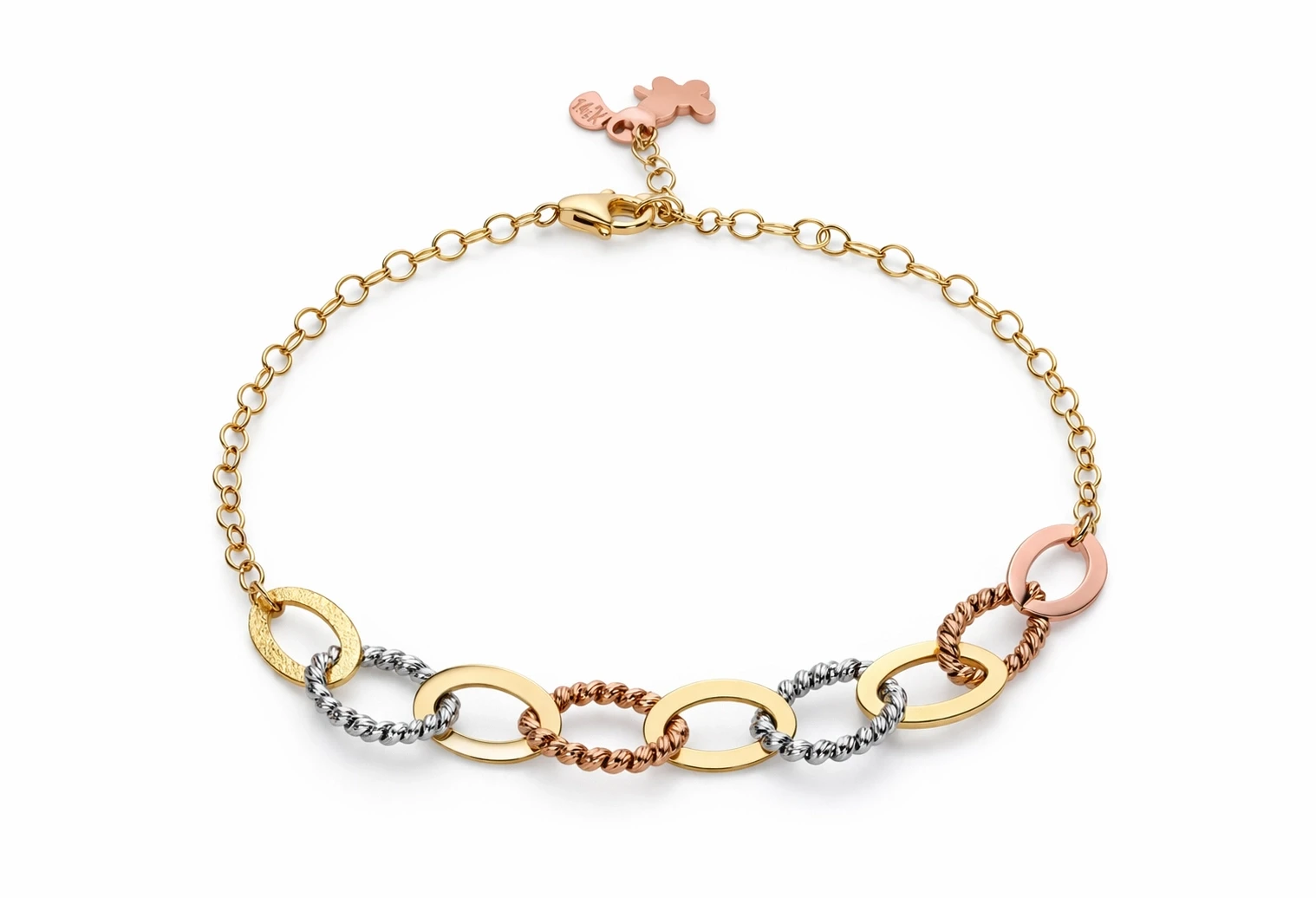 3,13 gram ağırlığındaki model, zincir form yapısı sayesinde bilekte zarif bir duruş sergiler. Farklı tonların bir araya gelmesiyle kombinlere dinamizm katar.