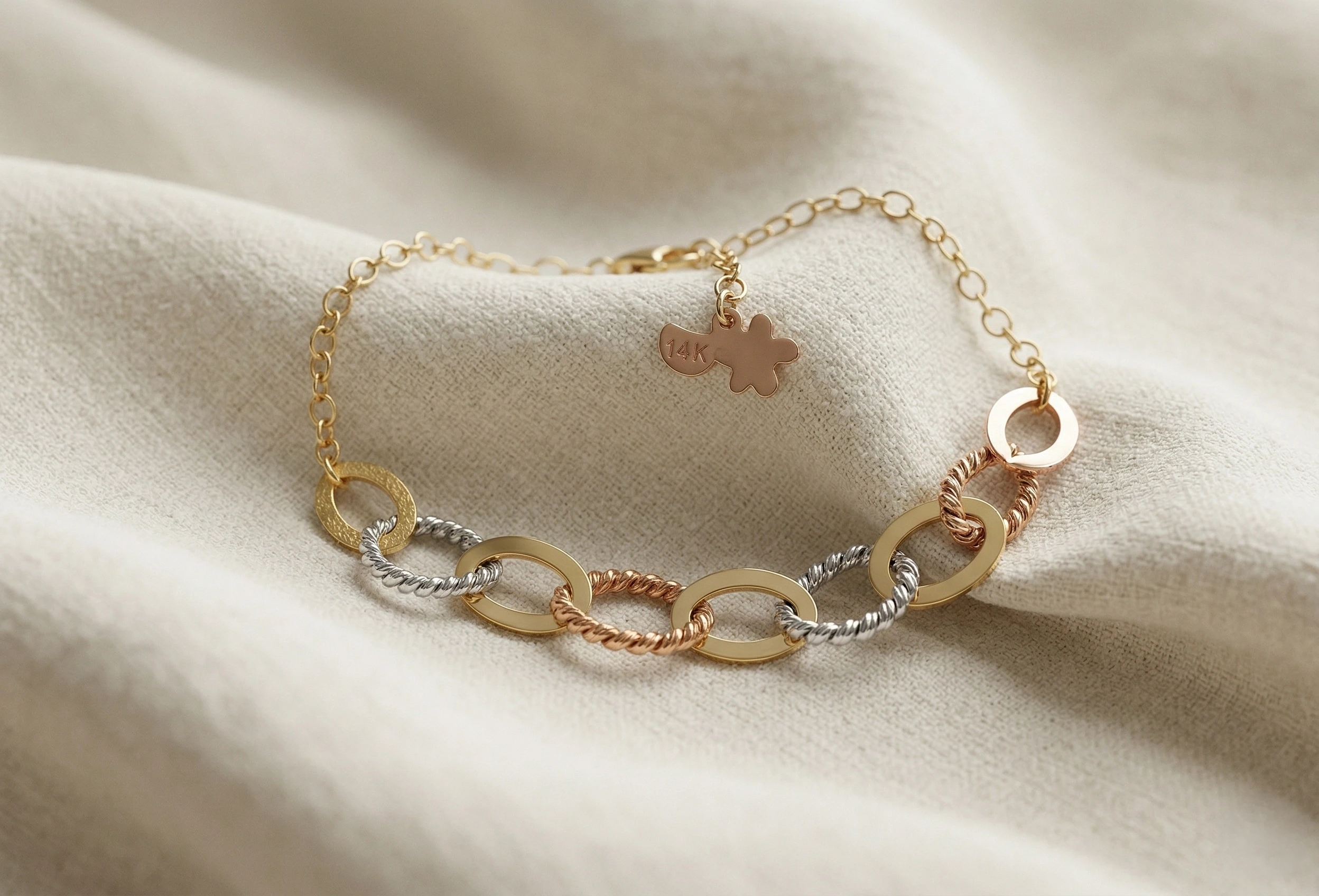 Üç farklı tonun uyumuyla tasarlanan bu bileklik, hareketli ve dikkat çekici bir stil sunar.